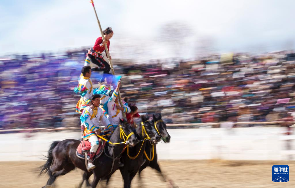 2月20日,馬術(shù)隊(duì)員在表演多人多馬疊羅漢。新華社記者 丁增尼達(dá) 攝