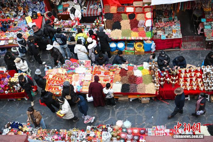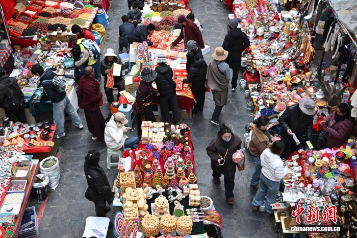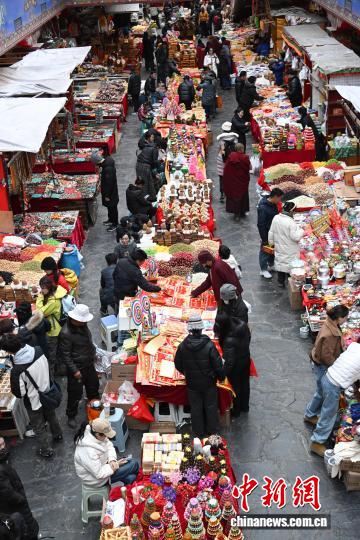 2月9日,隨著春節(jié)、藏歷新年臨近,西藏拉薩市八廓商城等年貨市場(chǎng)人頭攢動(dòng)。市民忙著挑選酥油花、香布、切瑪盒等傳統(tǒng)年貨,市場(chǎng)內(nèi)購銷兩旺、喜慶熱鬧,古城拉薩處處洋溢著濃厚的節(jié)日氛圍。圖為市民在八廓商城選購年貨切瑪盒。中新社記者 貢嘎來松 攝