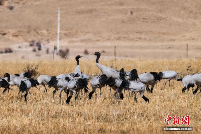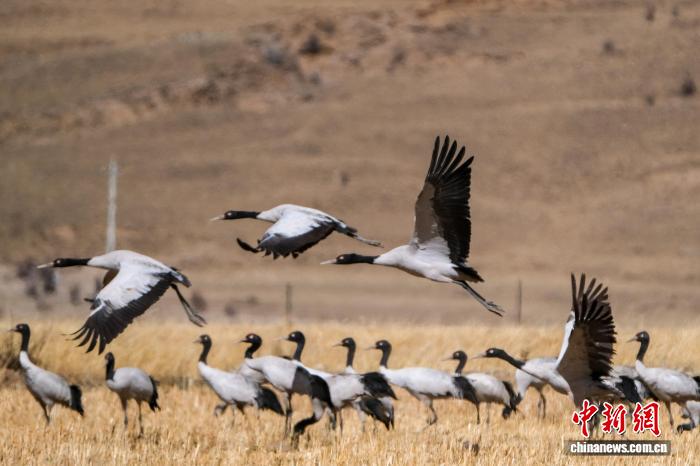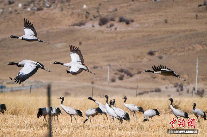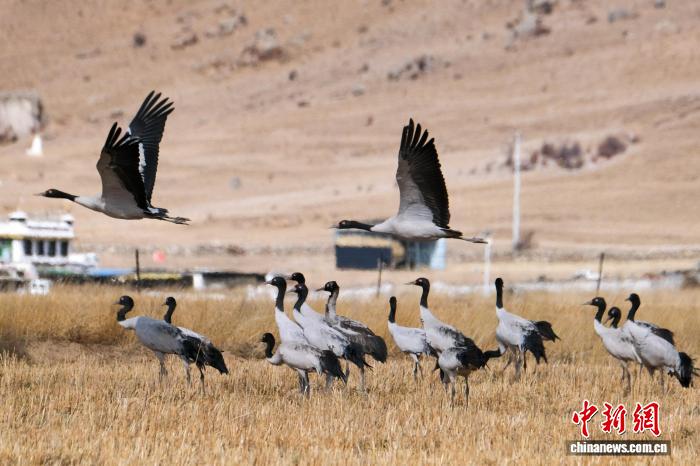 黑頸鶴是中國國家一級保護(hù)動物,是唯一生活、繁殖在高原的鶴類,被藏族民眾譽(yù)為“吉祥鳥”。近日,西藏自治區(qū)拉薩市林周縣林業(yè)和草原局介紹,作為黑頸鶴重要的越冬棲息地,今年該縣境內(nèi)黑頸鶴數(shù)量在1800只至2300只之間,其中虎頭山水庫卡東村一帶占比約一半。中新網(wǎng)記者在周邊看到,不少黑頸鶴在田間覓食,不時飛翔于高原農(nóng)田、村落上空,舞動的鶴影和聲聲鶴鳴為冬春時節(jié)的高原增添了幾分靈動。圖為2月8日,黑頸鶴群在悠閑覓食。江飛波 攝