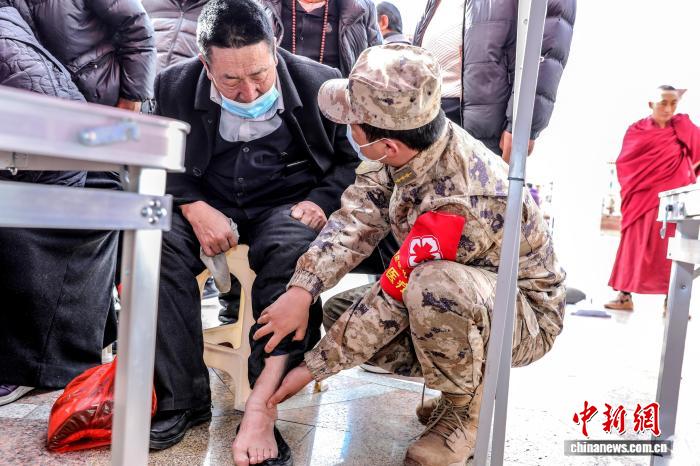 圖為軍醫(yī)為民眾檢查腿腳疼痛問(wèn)題。彭毅 供圖