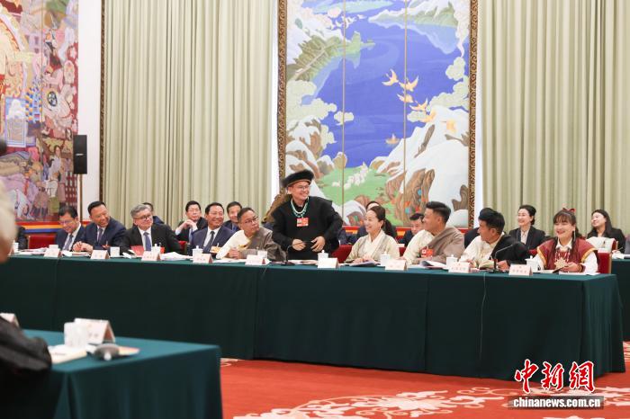 3月6日,全國人大代表扎西江村(中間起立者)身著珞巴族服飾,出席十四屆全國人大四次會議西藏代表團(tuán)開放團(tuán)組會議。中新社記者 楊郁然 攝