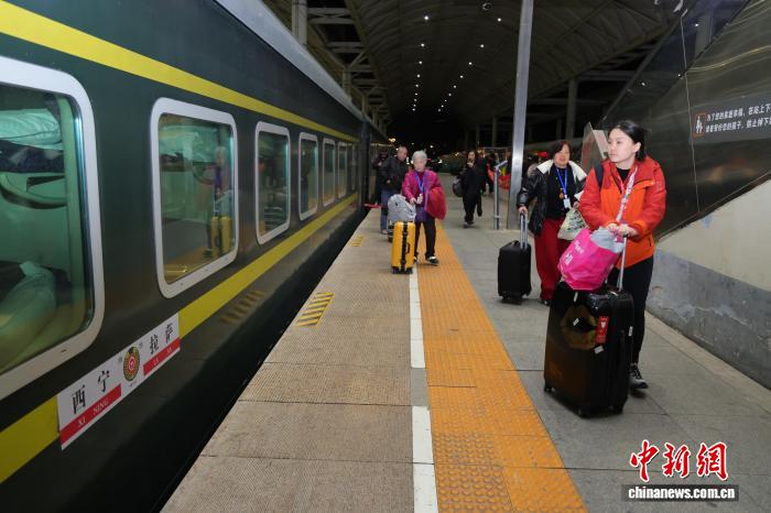 圖為3月6日晚,游客在西寧站登車,乘坐2026年首趟入藏旅游專列。周悅翔 攝