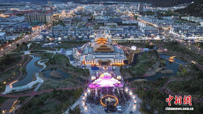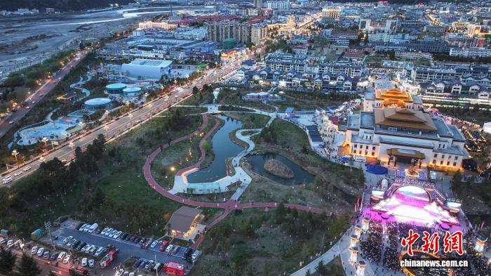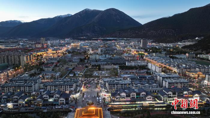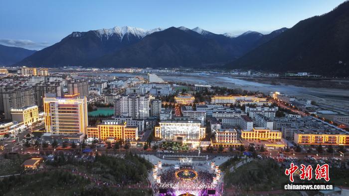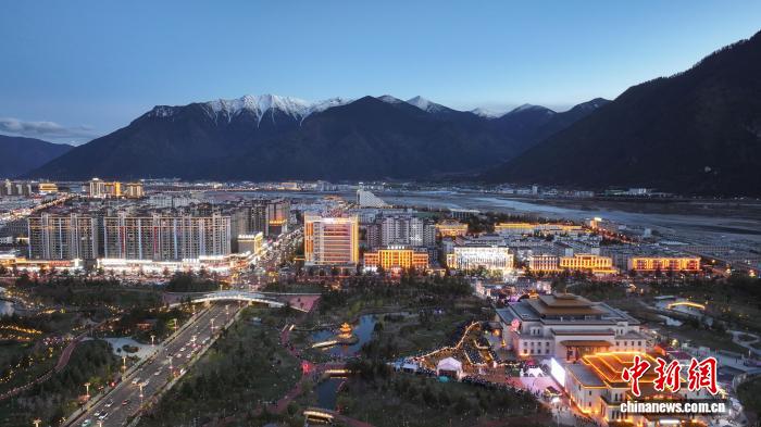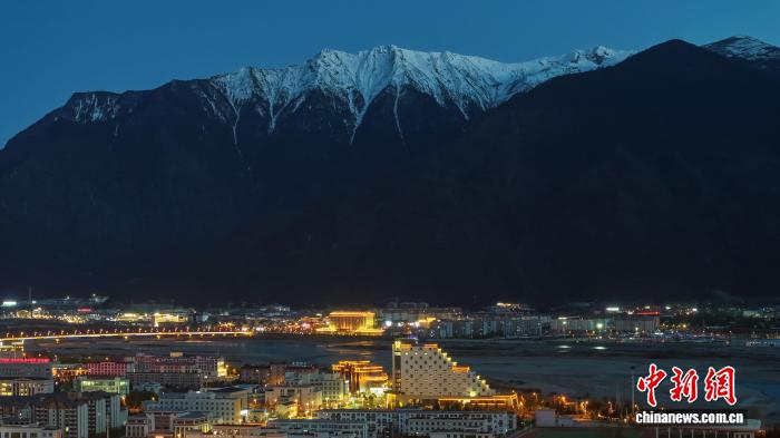 4月3日晚,西藏林芝市城市夜景美,城市建筑、街道的燈光與雪山相映成趣,景色美麗。(無人機照片)中新社記者 貢嘎來松 攝