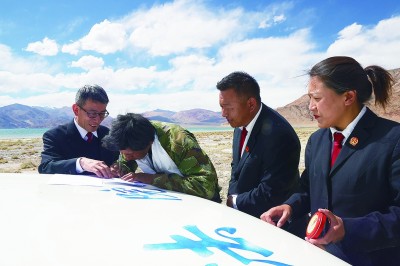 在阿里地區(qū)班公湖旁,常年驅(qū)車穿行于高山荒漠辦案的基層法官們?yōu)橛龅诫y題的牧民布曲真送來(lái)了調(diào)解書(shū)。布曲真與工程公司有勞務(wù)糾紛,經(jīng)法院訴前調(diào)解終于達(dá)成協(xié)議。事情解決了,法官們也開(kāi)心地笑了。光明日?qǐng)?bào)記者 劉宇航攝