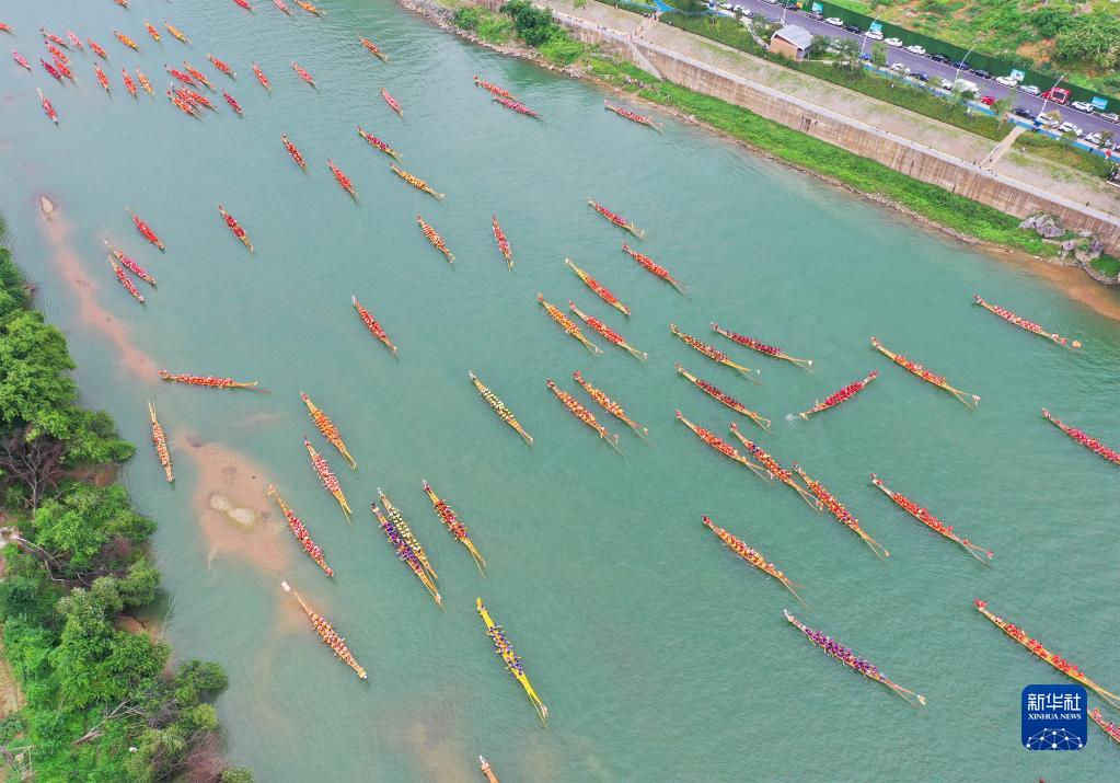 6月17日,多條龍舟在湖南省永州市道縣舉行的龍舟賽上競渡(無人機照片)。新華社發(fā)(何紅福攝)
