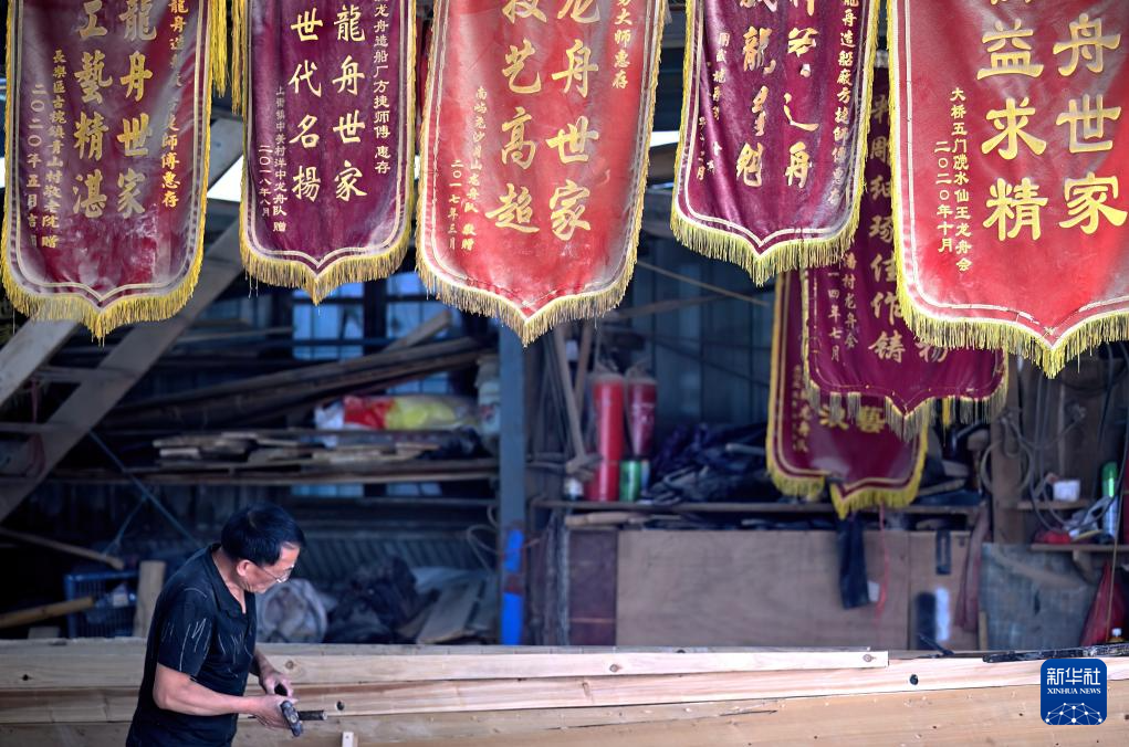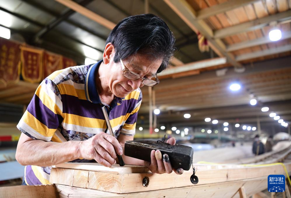 6月3日,在“龍舟世家”方忠雄龍舟廠,一名木工師傅在趕制端午節(jié)的龍舟訂單。新華社記者魏培全攝