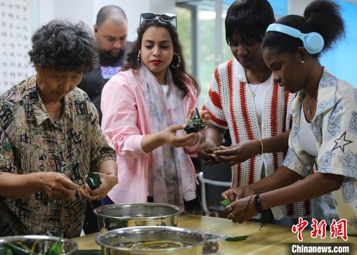 5月27日,在河北省秦皇島市海港區(qū)白塔嶺街道燕大西苑社區(qū),當(dāng)?shù)赝鈬?guó)留學(xué)生相聚一堂,通過(guò)包粽子、體驗(yàn)?zāi)景婺戤?huà)等方式,沉浸式體驗(yàn)中華文化的魅力。