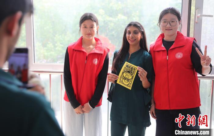 圖為外國(guó)留學(xué)生持作品與志愿者合影留念。曹建雄 攝