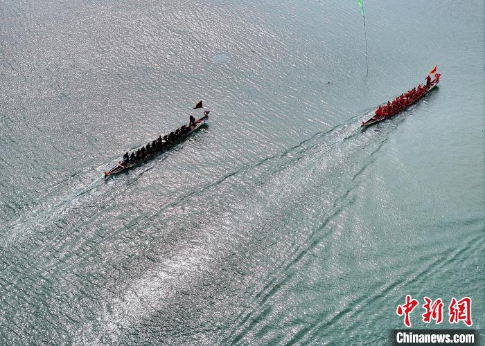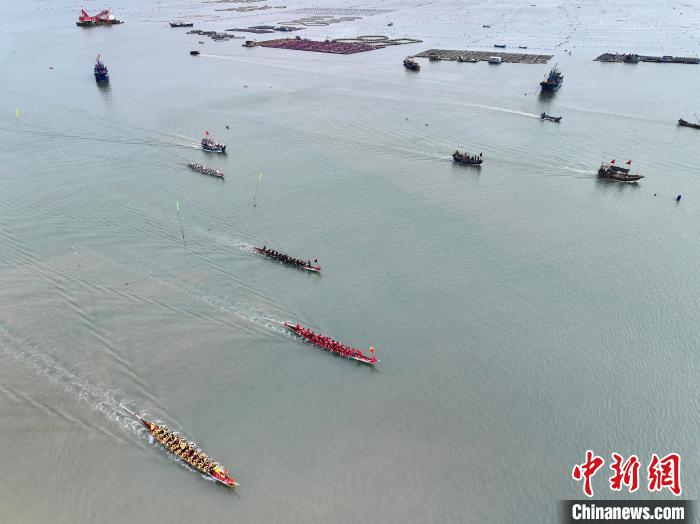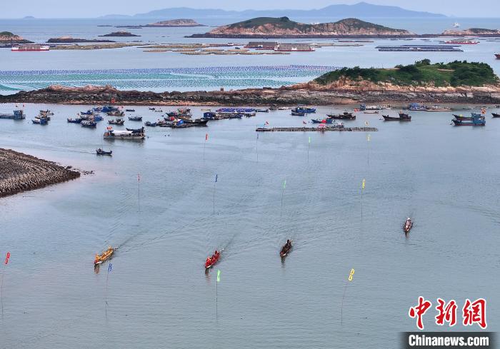 5月27日,福建省連江縣定海村舉行海上龍舟賽活動,迎接即將到來的端午節(jié)。(無人機照片)中新社記者 張斌 攝