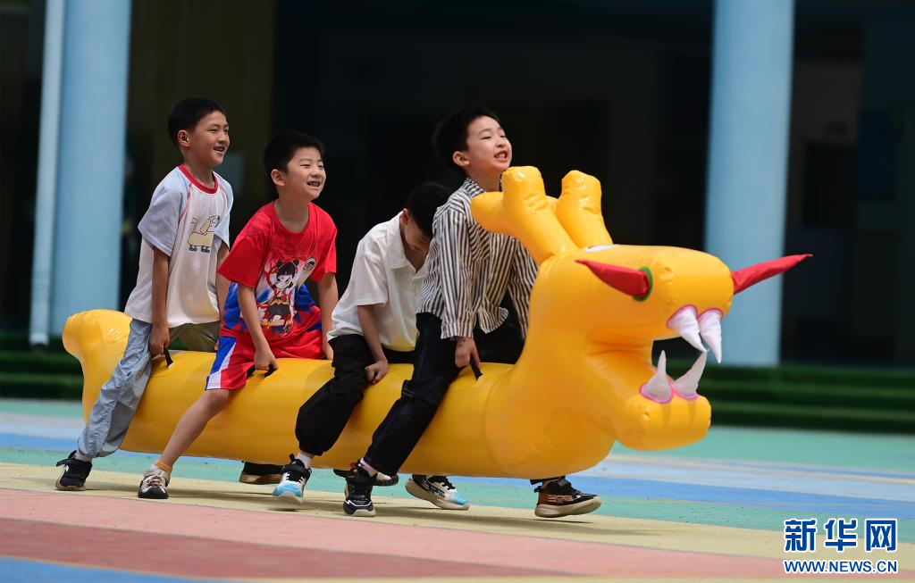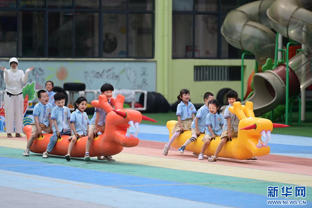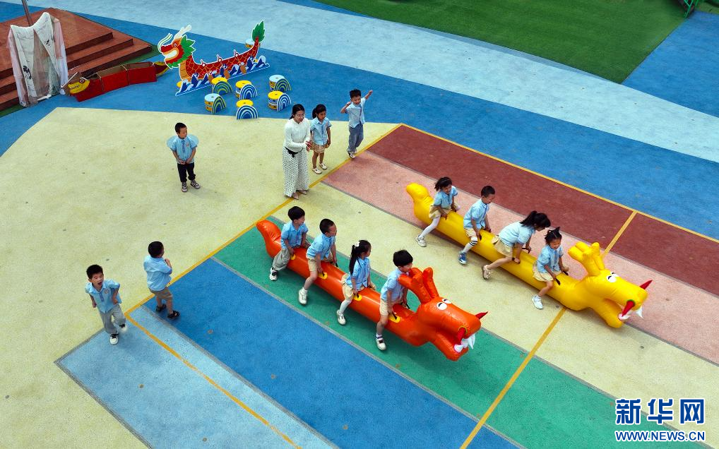 近日,在江西省宜春市萬載縣康樂幼兒園,孩子們?cè)谶M(jìn)行旱龍舟比賽。新華網(wǎng)發(fā) 鄧龍華 攝