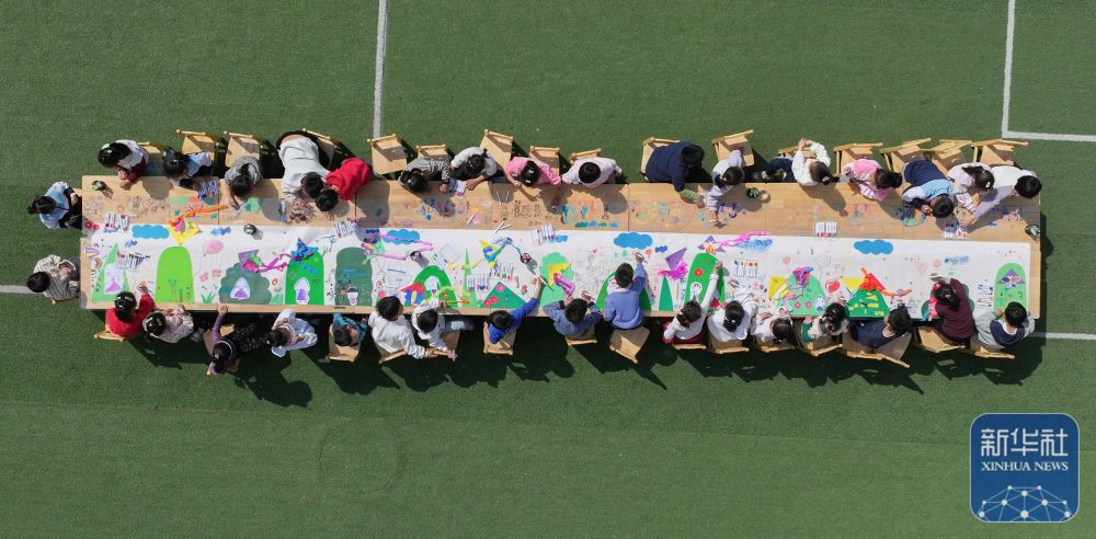 ↑ 4月3日,山東省鄒平市高新街道中心幼兒園的小朋友在繪制清明長(zhǎng)卷(無人機(jī)照片)。新華社發(fā)(董乃德攝)