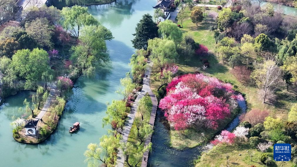 4月2日,游人在江蘇揚(yáng)州瘦西湖風(fēng)景區(qū)踏春賞景(無人機(jī)照片)。