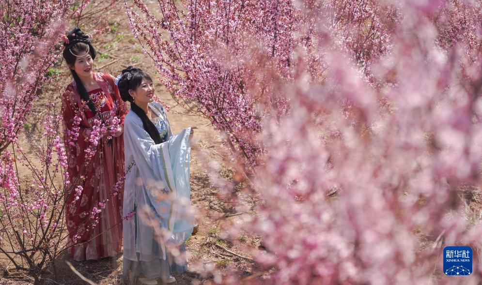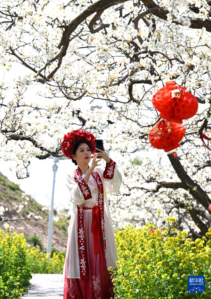 4月2日,傳統(tǒng)服飾愛好者在河北省石家莊市趙縣謝莊鎮(zhèn)梨果生產(chǎn)基地觀光拍照。