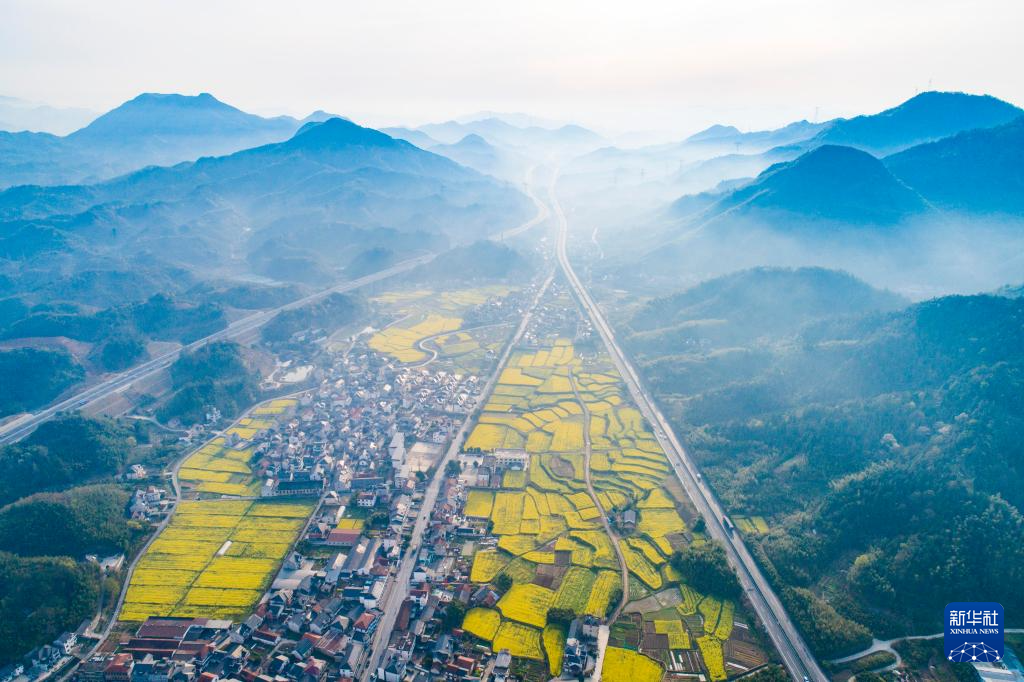 4月2日,在浙江省杭州市臨安區(qū)天目山鎮(zhèn)橫塘村,油菜花田與村莊、公路、群山構(gòu)成一幅美麗畫卷(無人機(jī)照片)。