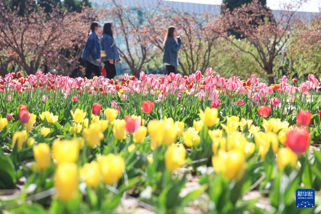 4月2日,游客在河北省石家莊植物園欣賞郁金香。
