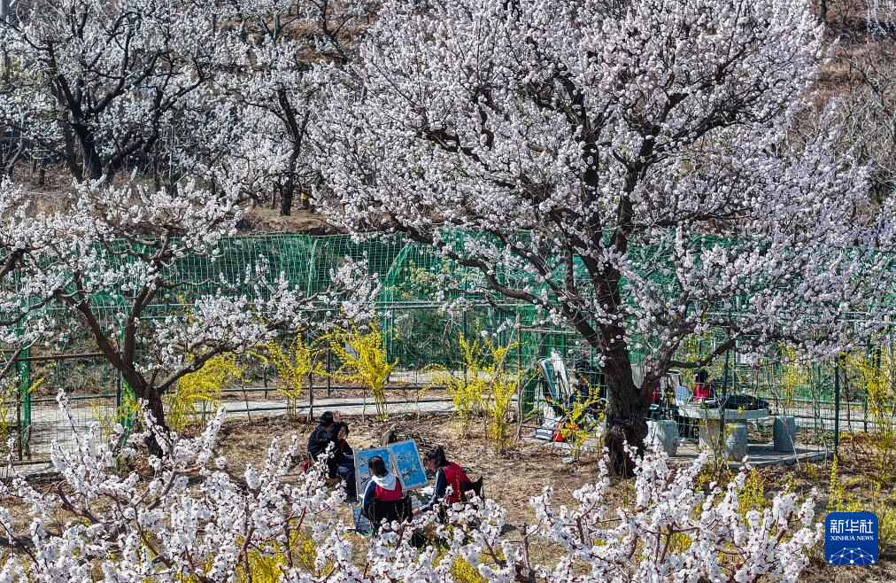 4月1日,河北省遵化市高級中學(xué)學(xué)生在遵化市南山常樂谷景區(qū)杏樹下寫生(無人機(jī)照片)。