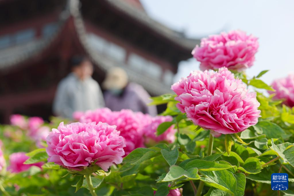 4月1日,在河南省駐馬店市汝南縣天中山文化園,游客在欣賞盛開的牡丹。