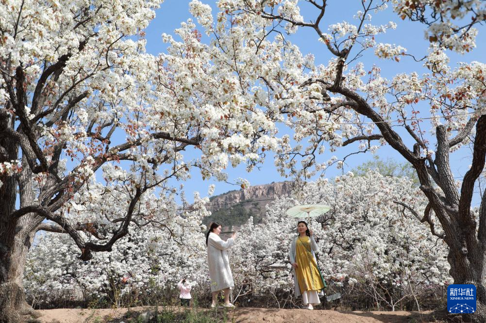 4月1日,在山東省臨沂市沂南縣馬牧池鄉(xiāng)西寺堡村梨園內(nèi),游客在梨樹下拍照。