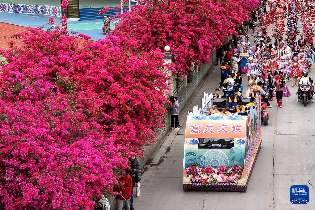 3月31日,廣西都安瑤族自治縣“三月三”慶典活動中,民俗文化巡游隊伍行走在花團(tuán)錦簇的街道上。