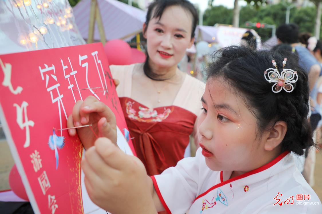 2025年8月20日傍晚,在安徽省六安市金安區(qū)東市街道開展的“七夕”游園會(huì)上,志愿者在帶領(lǐng)市民和小朋友手工制作香囊。當(dāng)日,六安市金安區(qū)東市街道在轄區(qū)金水灣體育公園開展“睦鄰東市·‘河’你共此夕”主題七夕游園會(huì)活動(dòng)。通過漆扇繪制、香囊制作、穿針乞巧等民俗體驗(yàn),吸引市民參與傳統(tǒng)文化互動(dòng),既傳承節(jié)日文化內(nèi)涵,又以文化活動(dòng)為紐帶促進(jìn)鄰里交流,營(yíng)造文明和諧社區(qū)氛圍,提升群眾獲得感和幸福感。(田凱平攝/光明圖片)
