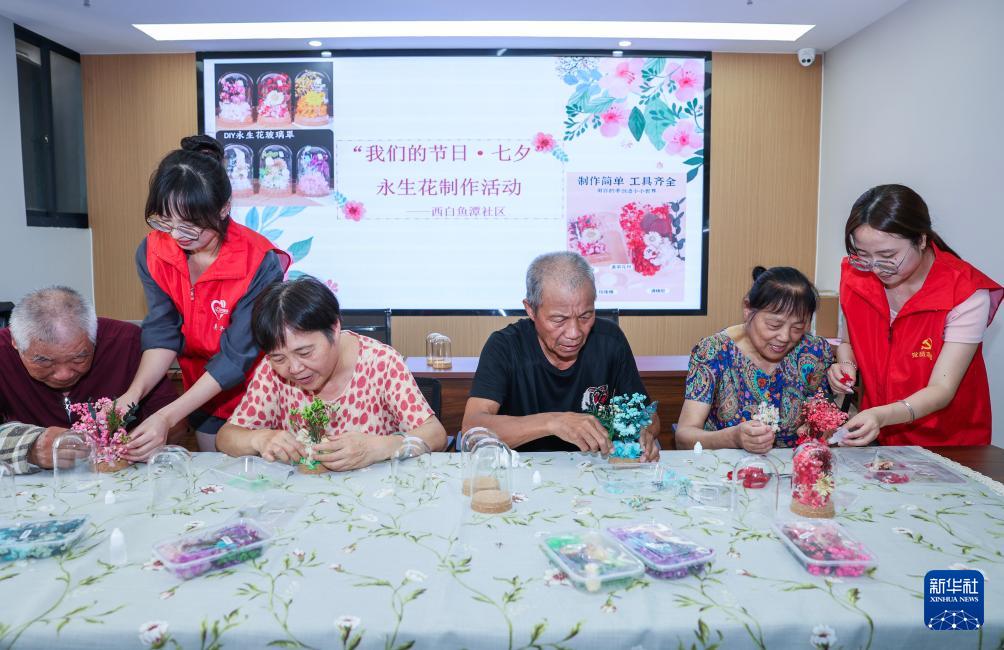8月6日,龍泉街道西白魚潭社區(qū)志愿者指導(dǎo)社區(qū)居民制作永生花。