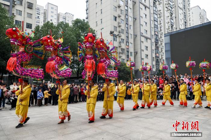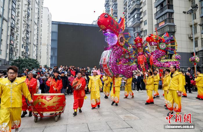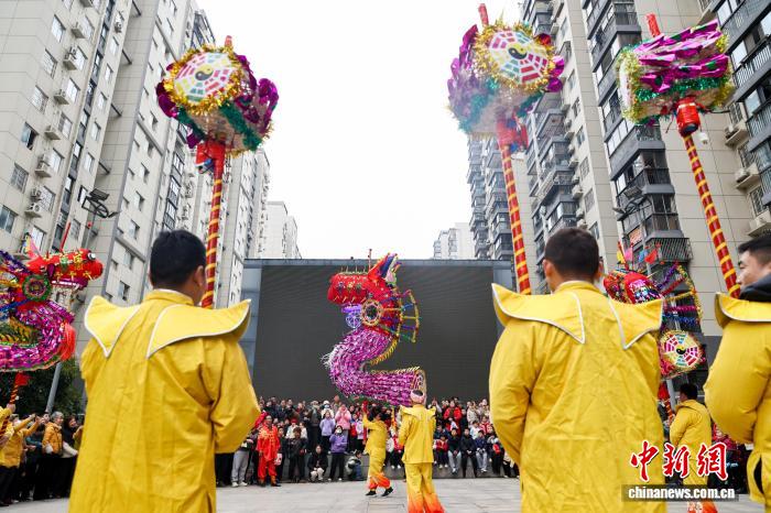2月27日,湖北武漢,國家級非遺漢陽高龍走進社區(qū)進行表演,以傳統(tǒng)民俗為居民送上馬年元宵祝福。圖為高龍隊隊員們?yōu)榫用襁M行表演。中新社記者 張暢 攝