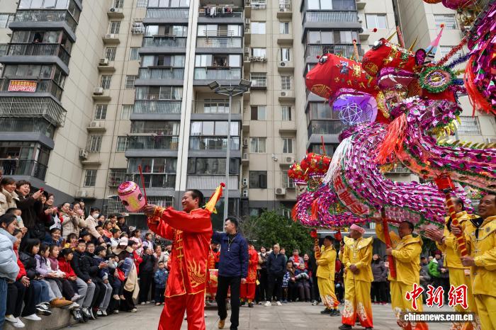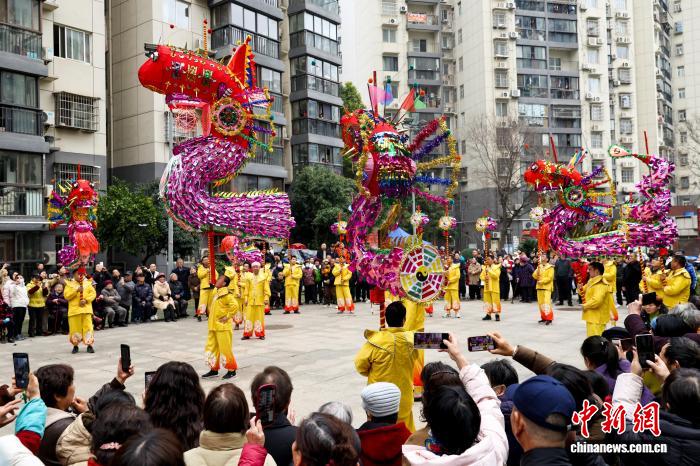 2月27日,湖北武漢,國家級非遺漢陽高龍走進社區(qū)進行表演,以傳統(tǒng)民俗為居民送上馬年元宵祝福。圖為高龍表演吸引民眾觀看。中新社記者 張暢 攝