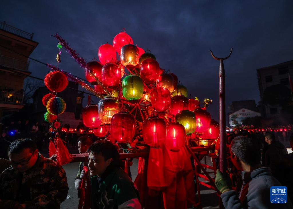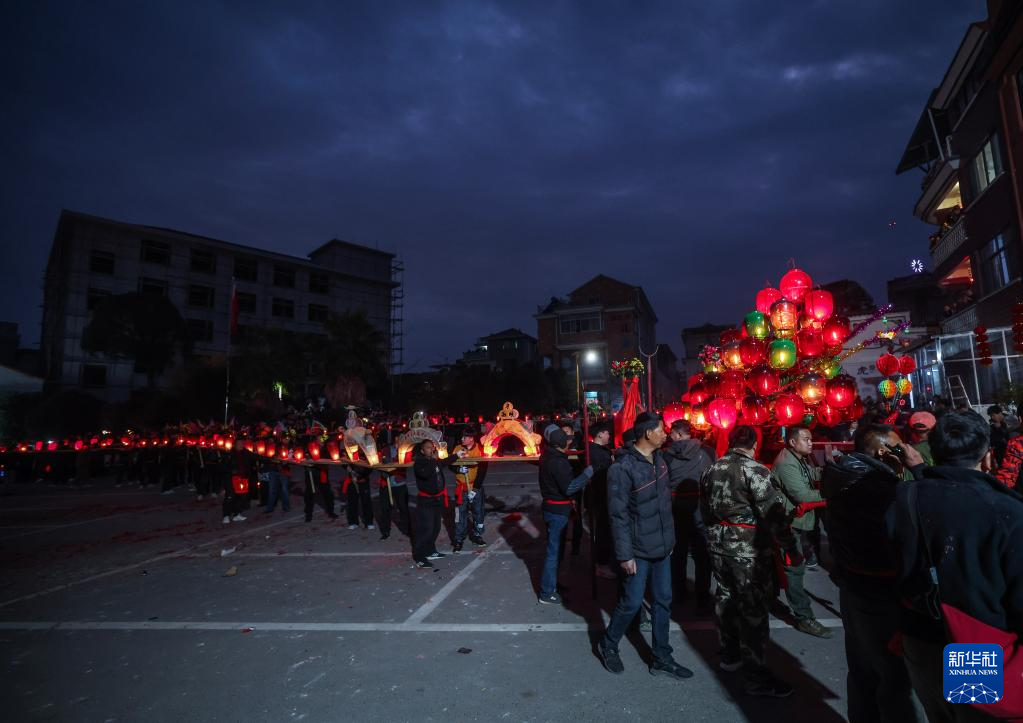 2月10日,赤松鎮(zhèn)虎巖村村民抬著板凳龍進(jìn)行巡游。