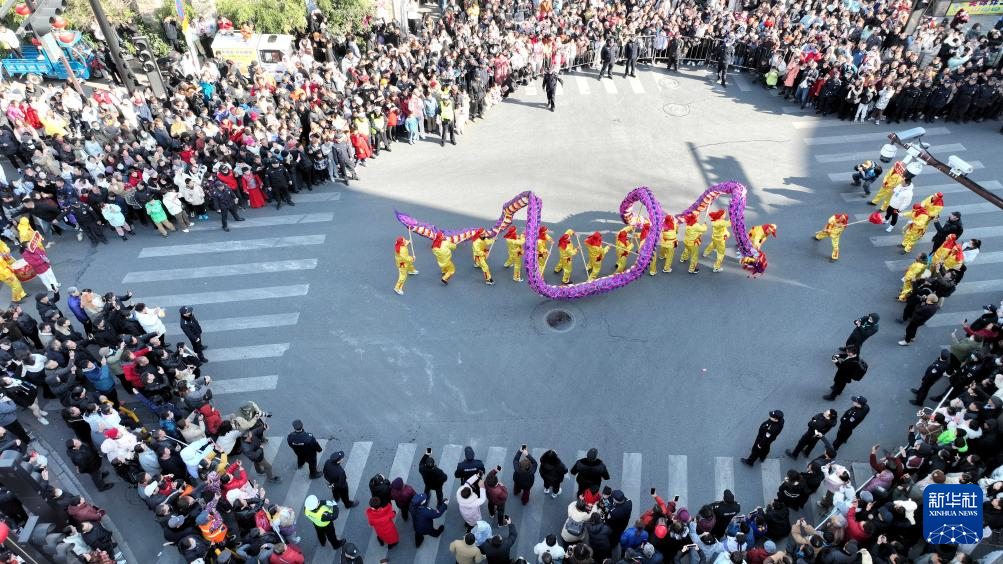 2月9日,舞龍隊在浙江省湖州市德清縣乾元鎮(zhèn)巡游展演(無人機照片)。
