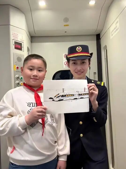 系著紅領(lǐng)巾的小旅客,雙手捧著一幅自己手繪的高鐵畫,遞到了列車長(zhǎng)面前。畫面上的列車線條流暢、細(xì)節(jié)生動(dòng),黑黃相間的車身仿佛正帶著少年的憧憬向前飛馳。列車長(zhǎng)笑著接過這份沉甸甸的心意,與少年并肩站在一起,共同舉起畫作。