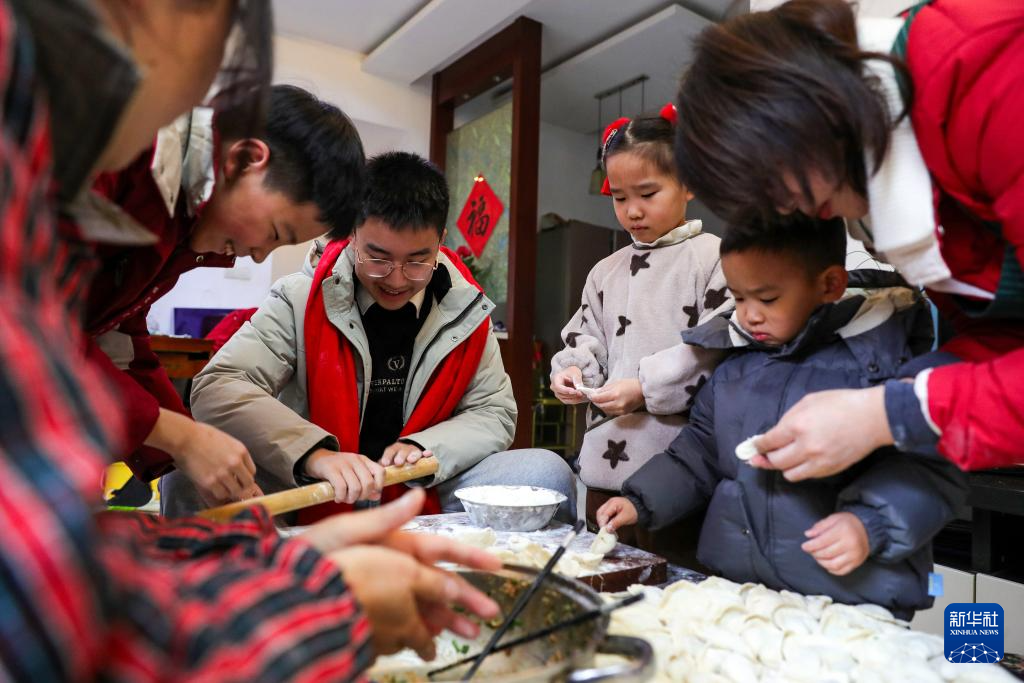 2月16日,在江蘇省揚州市邗江區(qū)荷葉小區(qū)一戶人家,大人帶著孩子包餃子。新華社發(fā)(齊立廣攝)
