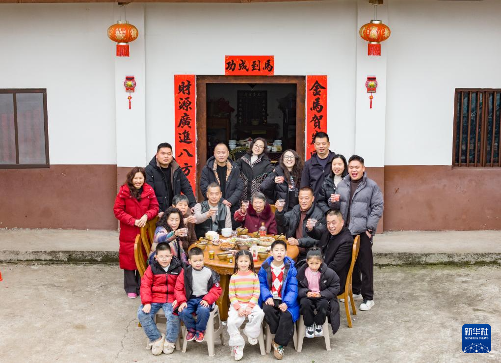 2月16日,在四川省南充市順慶區(qū)清平村,村民陳俊堯一家祖孫四代吃團年飯。新華社發(fā)(彭珉翔攝)