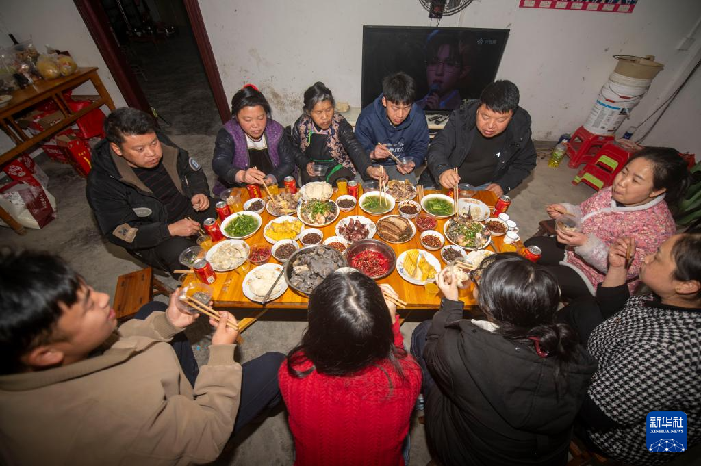 2月16日,貴州省黔東南苗族侗族自治州從江縣丙妹鎮(zhèn)大塘村一戶居民吃年夜飯。新華社發(fā)(吳德軍攝)