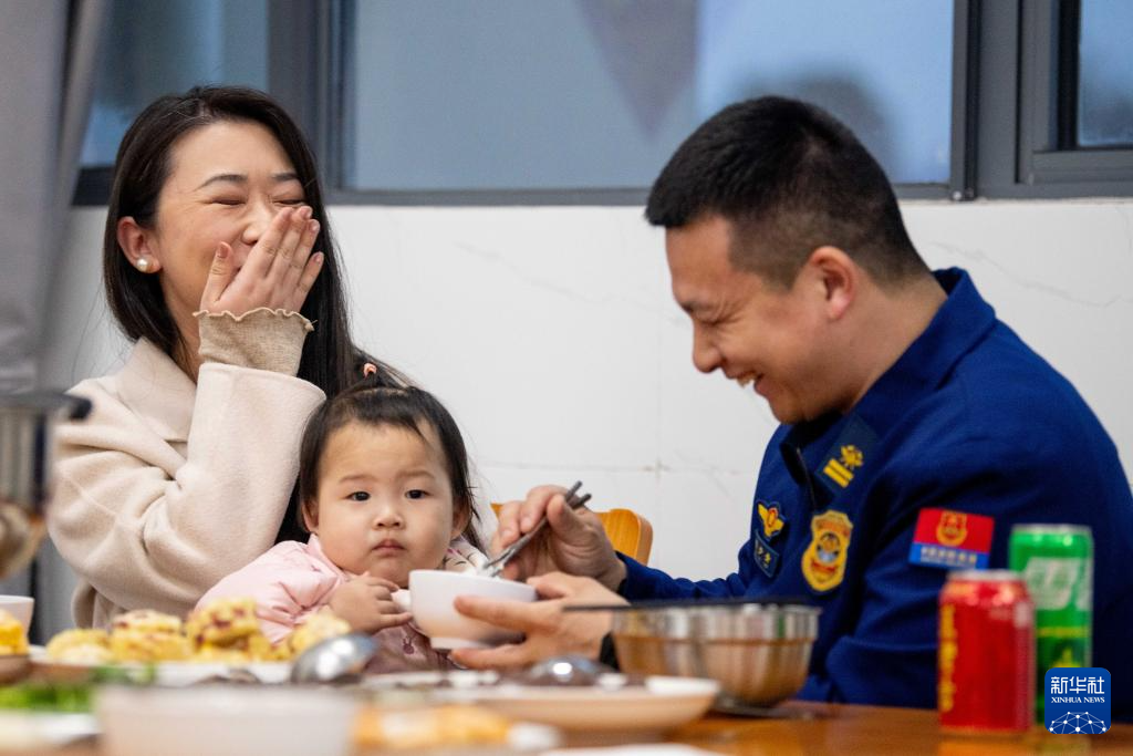 2月16日,在江蘇省泰興市澄江西路消防救援站,消防員和家屬一起吃團圓飯。新華社發(fā)(楊玉崗攝)