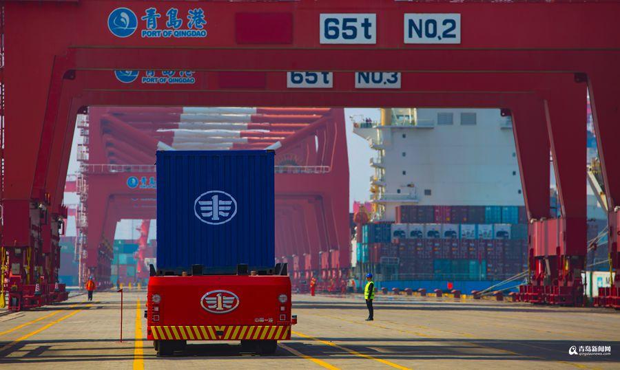 青島港全自動(dòng)運(yùn)輸車(chē)行駛中。