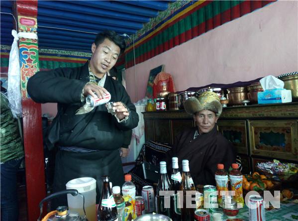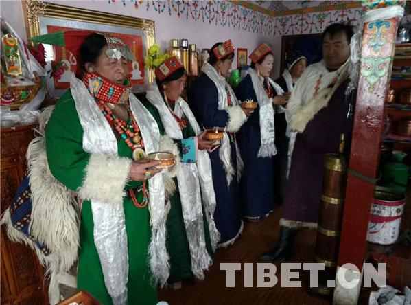 據(jù)了解,在藏歷十月三十白天,婦女們給孩子和自己洗發(fā),準(zhǔn)備過(guò)年的材料,如釀制青稞酒、制作油炸果子等。晚上10點(diǎn)左右,家中派出男性,舉行驅(qū)鬼儀式。大年初一的上午,全村的男人們騎上駿馬,到村落的山神處祭祀,更換經(jīng)幡,誦經(jīng)祈福。各家各戶回家后就在家中聚會(huì),一般是不出去的,個(gè)別時(shí)候,家中派出兩三個(gè)青年男女手持青稞酒和酒碗,端著切瑪盒,切瑪盒內(nèi)裝有青稞、糌粑、五彩的吉祥草,帶上青稞酒,到隔壁鄰居或親戚家拜年,見(jiàn)面后,互相祝福吉祥,敬獻(xiàn)青稞酒,各自抓起對(duì)方切瑪盒內(nèi)的青稞粒拋向空中,摔三下,祭拜天、地、神,祈禱新年吉祥如意。