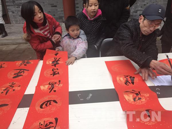 1月26日,2018年“新時(shí)代、新夢(mèng)想”全國網(wǎng)絡(luò)媒體新春走基層活動(dòng)(四川站)媒體團(tuán)走進(jìn)廣安市前鋒區(qū)代市鎮(zhèn)會(huì)龍村。記者們走過一排排獨(dú)具川東民居特色的房屋,看到一群中老年人正在寬敞的空地上跳著廣場(chǎng)舞,不遠(yuǎn)處的村民活動(dòng)站內(nèi),幾位六七十歲的老大爺正聚在一起拉著二胡唱著歌,不遠(yuǎn)處支起一張長長的桌子,一位老人正在為村民們寫著春聯(lián),“現(xiàn)在眼看著日子好起來了,大家都搬進(jìn)了新房??爝^年了,我在這給大伙免費(fèi)寫春聯(lián),添添喜氣?,F(xiàn)在我也有徒弟了,村上好幾個(gè)人平常有空了都來跟我學(xué)學(xué)寫字啥的?!狈接烂骼先诉厡懽诌厡?duì)記者說道。眼前這番景象,很難讓人將會(huì)龍村和貧困村聯(lián)系在一起。
