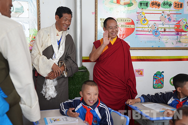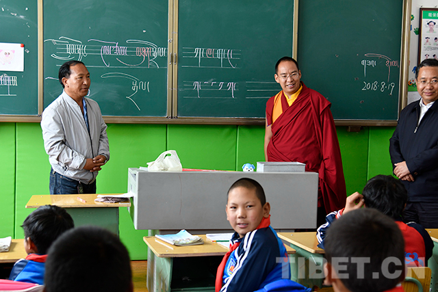 圖為十一世班禪向老師了解孩子們的學習情況。攝影:扎西