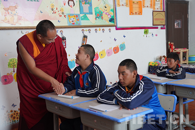圖為十一世班禪看望殘障學生并與師生交流。攝影:王淑