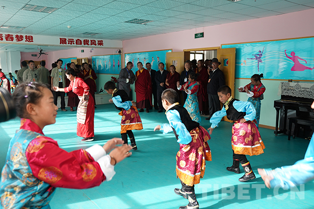 圖為十一世班禪來到舞蹈室觀看孩子們跳舞。攝影:王淑