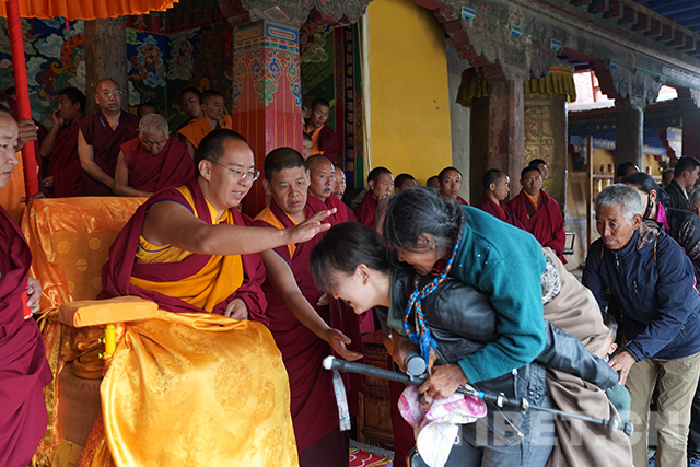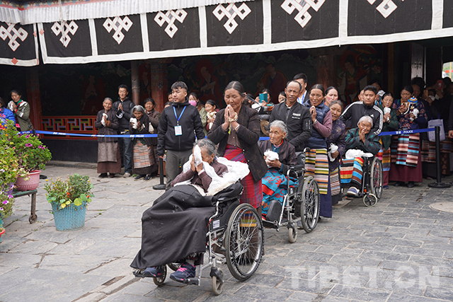 禮佛活動(dòng)結(jié)束后,十一世班禪登上設(shè)在杜康殿門前的法座,為信教群眾摸頂賜福。此時(shí),寺院外的廣場上,信教群眾已從四面八方趕來。隊(duì)伍里,有拄著拐杖的老人,有坐著輪椅來的老人,還有被年輕人背來的老人。