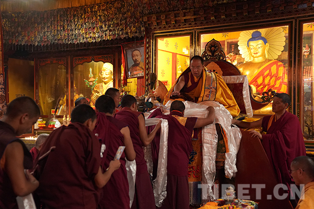十一世班禪頭戴金色佛冠,由手持香炷的僧人引領(lǐng),緩緩步入杜康大殿。在僧人們渾厚的誦經(jīng)聲中,十一世班禪登上法座,領(lǐng)誦經(jīng)文。寺廟僧人向十一世班禪敬獻(xiàn)曼扎等,十一世班禪微笑接過后,為僧人摸頂賜福,并發(fā)放布施、供齋茶齋飯。隨后,十一世班禪朝拜珍珠唐卡殿。