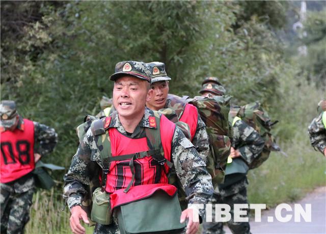 圖為藏族班長覺次仁,一人肩扛兩個(gè)背囊,“飛奔”在五公里武裝越野比武考核的路上。