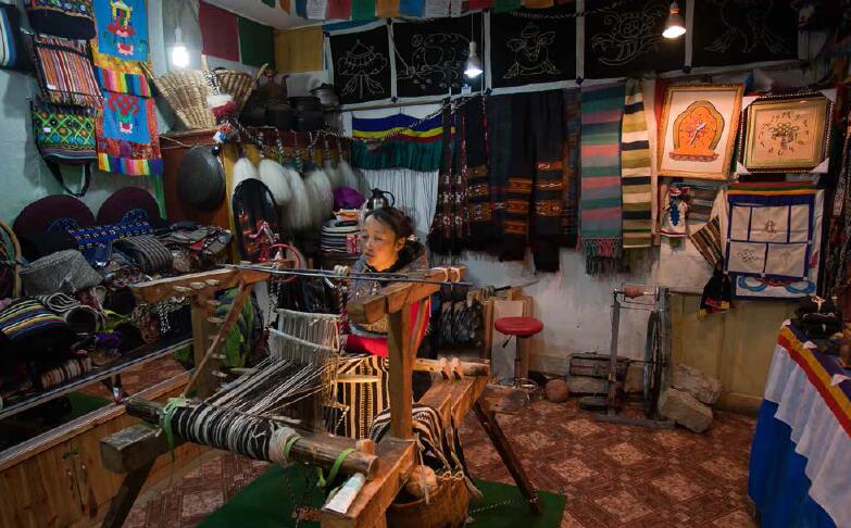 店內(nèi)的款式多樣、設計新穎、做工精細的背包、挎包、圍巾、毛毯等,簡直是拉薩民間手工編織工藝品的大集合,珠杰的小女兒正在編織氆氌。