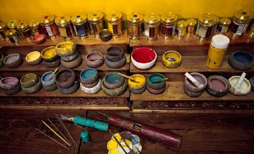 在八廓街古老的夏扎大院里,清晨的光線非常柔和地斜斜照進(jìn)窗楣里,一樓的一排走廊式狹長的工作坊內(nèi),是一群來自日喀則、昌都等不同地方的藏族姑娘,她們愉快地哼著歌謠,一邊用手反復(fù)捶硯石盤內(nèi)的顏料,這些五顏六色的顏料就在陽光下閃爍著迷人的光芒。