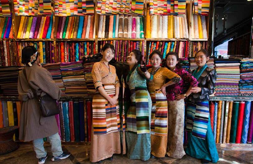 北京中路上,藏裝店里的年輕姑娘們穿著自家店里的藏裝,更顯出獨(dú)特的時(shí)尚與個(gè)性氣質(zhì)。