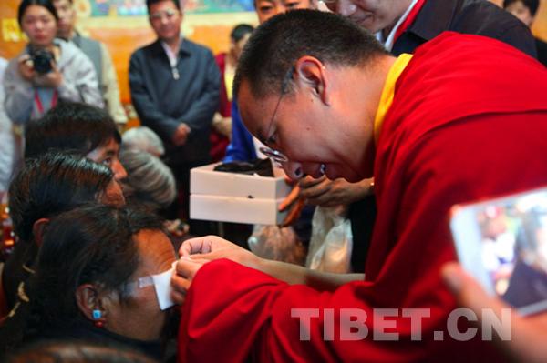 捐贈(zèng)儀式當(dāng)天,接受復(fù)明手術(shù)的32名老年白內(nèi)障患者,帶著他們的感激之情來到捐贈(zèng)儀式現(xiàn)場(chǎng),十一世班禪小心翼翼地親手逐一為患者們揭開了覆蓋在眼睛上的紗布,并向他們贈(zèng)送了護(hù)目眼鏡。圖為十一世班禪細(xì)心地為患者揭開覆蓋在眼睛上的紗布。攝影:王淑