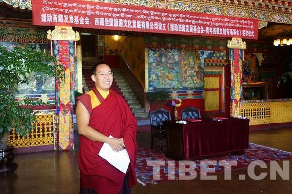 為推動(dòng)西藏社會(huì)經(jīng)濟(jì)文化產(chǎn)業(yè)的發(fā)展,促進(jìn)各族青年交往、交流、交融,推進(jìn)民族團(tuán)結(jié),9月24日,援助西藏發(fā)展基金會(huì)與坐望旅游文化發(fā)展有限公司在西藏日喀則德慶格桑頗章簽署了“青年文創(chuàng)專項(xiàng)基金戰(zhàn)略合作協(xié)議”。圖為十一世班禪在簽字儀式上講話。攝影:王淑