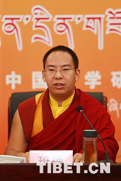 中國佛教協(xié)會副會長班禪額爾德尼·確吉杰布在教義闡釋研討會上作主旨發(fā)言。 圖/許娜