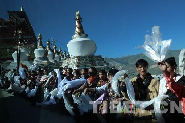班禪大師到來當天,結古寺大門口煨桑的香煙繚繞,用白石灰畫的迎接道花紋華美,玉樹市的群眾在道路兩旁歡迎班禪大師的車隊。